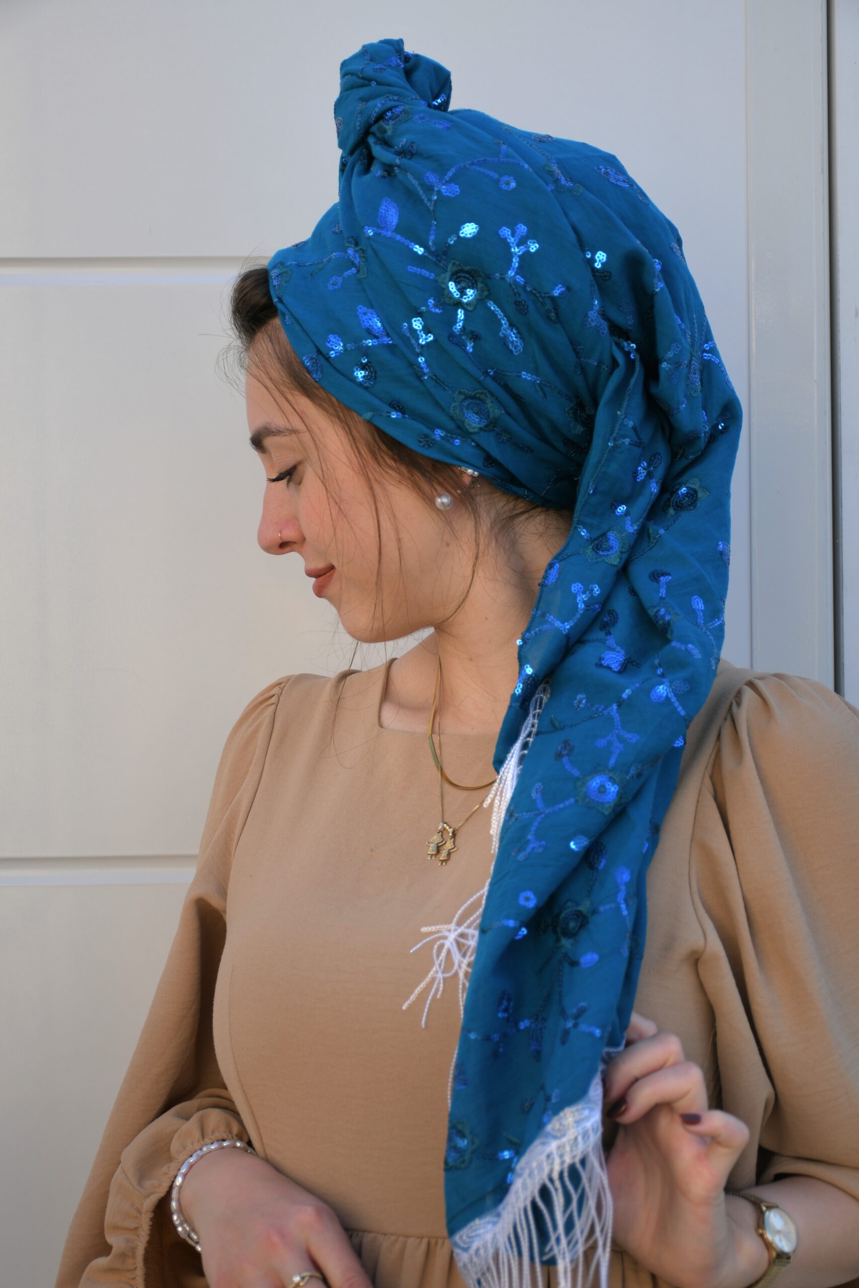 מטפחת מבד כותנה עם רקמת פייטים יוקרתית, כזאת שכיף לקשור ומקפציה כל הופעה!