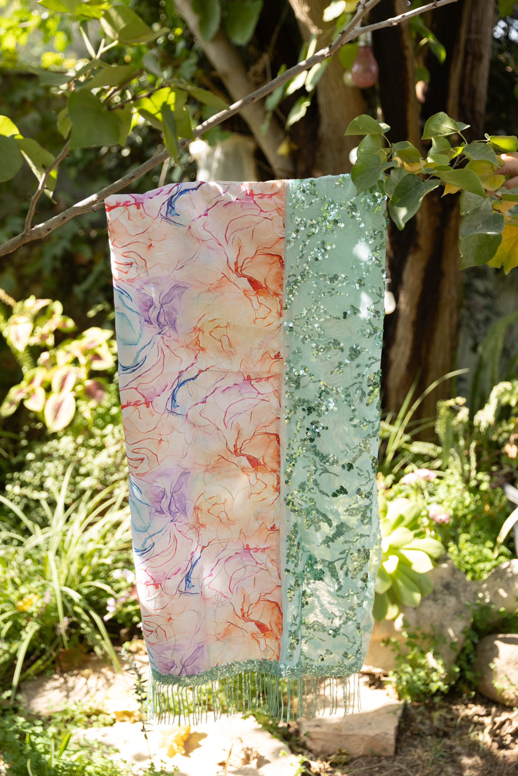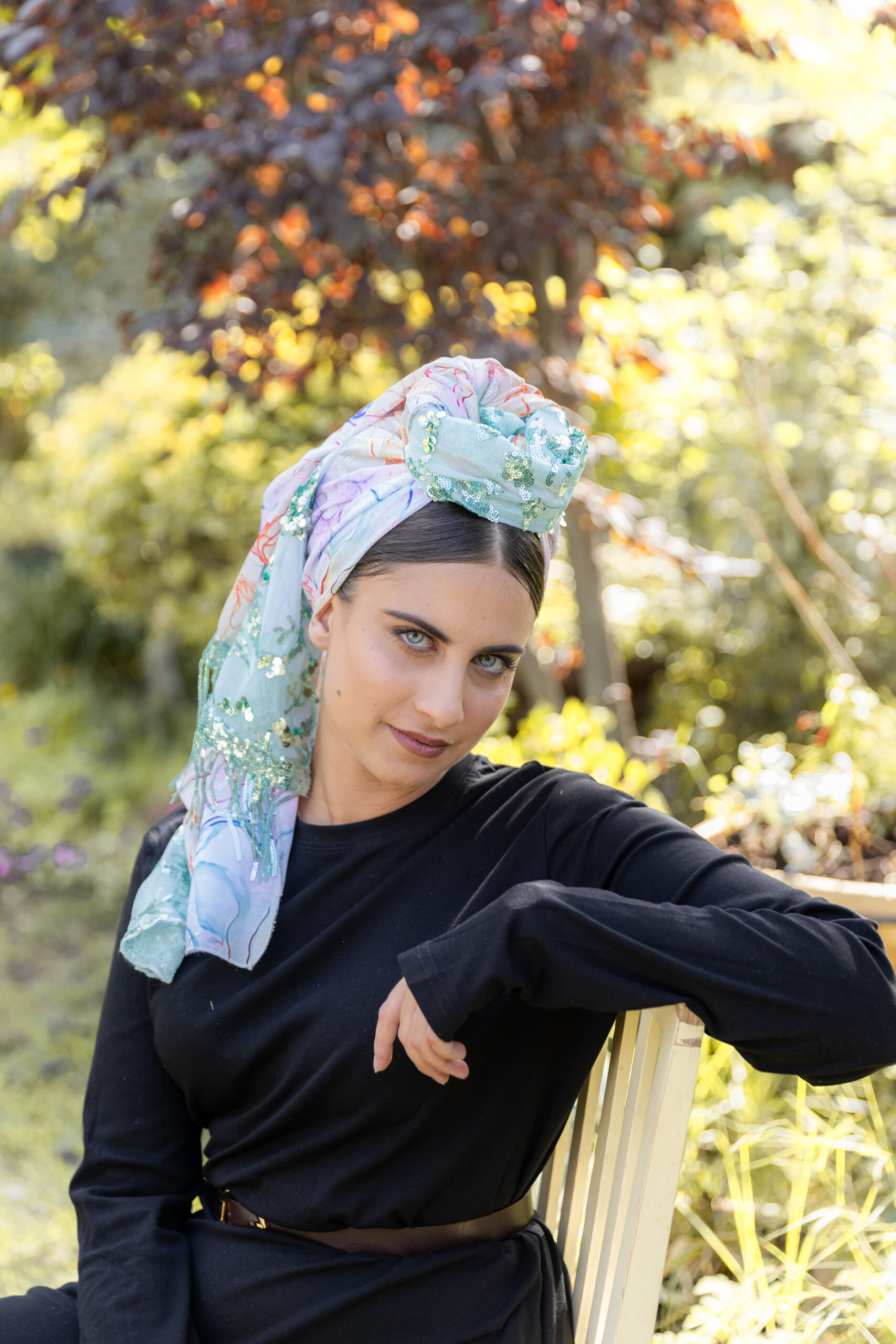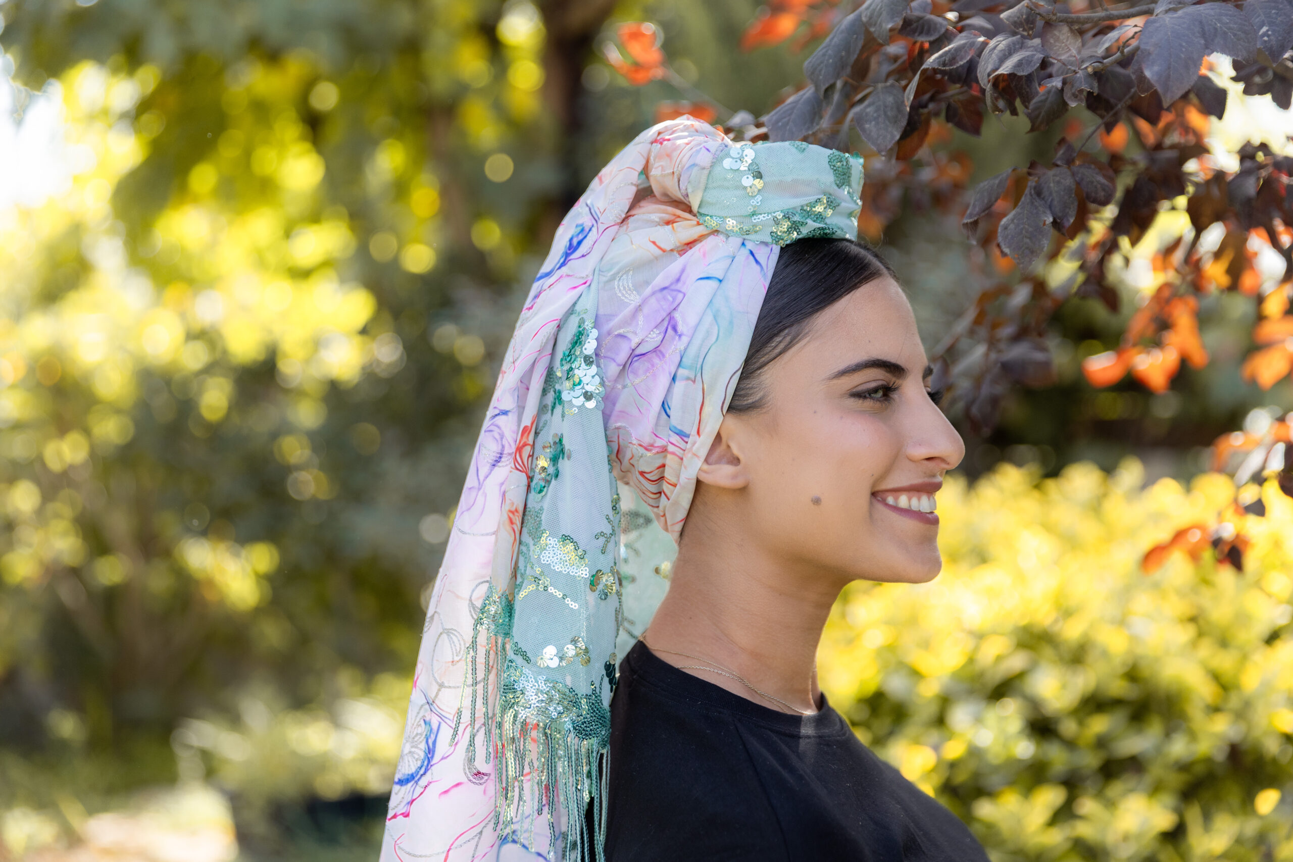 מטפחת דגם רז משולבת בד מודפס קליל ונוח לקשירה ביחד עם בד פייטים חגיגי ונוח, בשולי המטפחת משולב סרט פרנזים חגיגי.